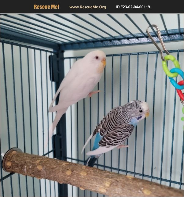 Two budgies for adoption. They were bought in May 2022 and appear to be young adult birds now. They get along very well with each other and love to talk. I cannot support having them in my home so I would love if someone could please consider adopting these two lovely birds. White is Casper and the blue one is Blueberry. Comes with large cage, toys and some bird feed.