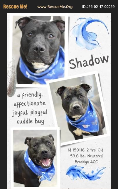 SHADOW was dumped at the cruel New York City kill pound where he was rescued from certain death and placed with an experienced foster who writes about the 2-yr-old 65 pound gentle giant exactly as follows: 'I've had Shadow at my dad's house in NJ and at my house here in PA. He isn't bothered by any stimulus: people passing, motorcycles, cars, bikes, baby carriages, kids playing, dogs being walked close by, and even a wheel chair race in the park didn't faze him! He does like to chase rabbits and squirrels, so I wouldn't recommend placing him in a home with cats but he should be fine with other dogs. I have taken his food away and taken toys from him and he shows no sign of resource guarding. And I can pet him all over with no sign of touch sensitivity. I've left him in the car while I run into the market and in the house uncrated with no problems. His kill pound notes say he has separation anxiety but I don't see any sign of this whatsoever. He is very well behaved in the home, car and yard, and Shadow has not chewed or destroyed anything in my home. He sleeps on his dog bed next to my bed all night, getting up only when I get up. He's had full access in our home from the second day, and loves being a couch potato as much as he loves running and playing in the yard. Shadow has the cutest little voice that sounds like a cross between a dog and a mouse that sounds more like a squeak than a bark. I love this dog! He has not been tested with children but had no reaction to them in the park, and I cannot imagine him being aggressive and I have seen no sign of aggression in him at all. He's very loving and always wants to be with his people. He loves my 97-yr-old father and even though he sometimes doesn't seem to know his own size or strength, is very gentle with him. I just have to keep him from climbing into his lap, lol. My dad seriously said he wants to keep him today! I'm not a trainer but I have a lot of dog experience and I think Shadow would be fine in a home with older, respectful children (7+) and another large dog with proper intros. A new adopter should continue working on his leash manners which have improved tremendously, but he's very strong so this is important. That being said, Shadow is a super sweet, well behaved rescue dog that will flourish in any loving home.' SHADOW has a low adoption fee of $200 but he'll arrive neutered, up-to-date on all shots, and his rescuers will transport him for FREE to virtually any home in the USA! Please click the YouTube button above to see his video edited by the volunteers in the New York City kill pound who loved him. For more pictures, videos and the rest of SHADOW's rescue story, please call Andrew anytime at (646) 387-9868. Thank You for your interest in SHADOW!