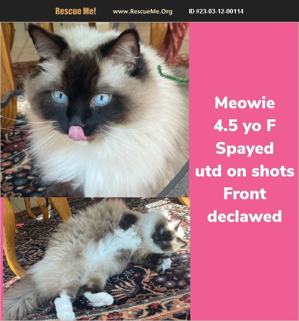 Meowie needs to be rehomed, because the young children in her household upset her and cause anxiety. She needs an adult only or a Home with only older children. She is very loving and affectionate. She uses the litter box purrfect. We require vet references to adopt this cat.