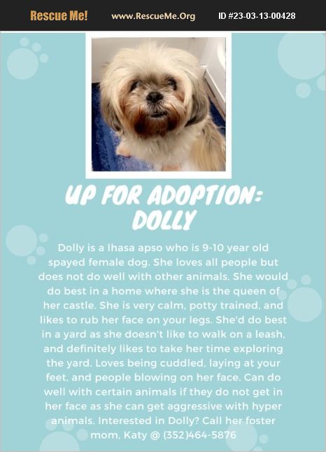 Dolly is very sweet with all people, she can be okay with older children but she doesn't like young ones pulling at her hair. She would do best with an older couple or family willing to give her another chance. Her mother passed away and she was inherited by her granddaughter who could not keep her due to her aggression towards her own dog. She likes belly rubs and to rub her face on you. Her distemper and rabies is up to date and she is the sweetest thing possible. She is so excited to see you get home and just wants a house with a fenced in yard and a family to love her. Please give her a chance.