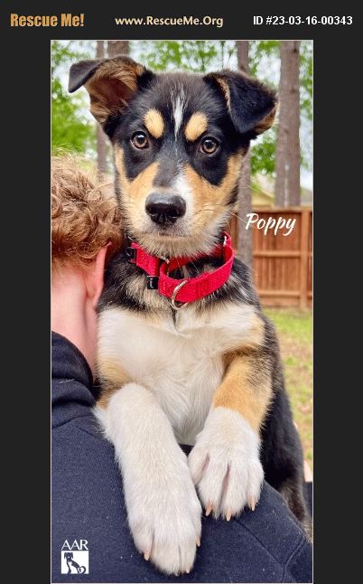 Poppy is an adorable Australian Shepard mix puppy who had a rough beginning. She was born to a feral mama and spent the first six weeks of her life living with her 3 siblings in the woods. The rescuer was able to find homes for the other 3 puppies and we were able to take Poppy. When she went into the foster's home, she was very timid and scared as she had never been around people. In the last 6 weeks she has really come out of her shell. She loves to play and did very well with the foster's 2 dogs, who have taught her how to 'dog.' She has come to trust her foster mom and no longer runs and hides when she sees a new person. She is working on potty training and willingly uses the doggy door. She is kennel trained and will sleep through the night. Poppy would flourish in a home with other dogs, who seem to help her confidence. Come meet this sweet, beautiful girl! 13 lbs and growing! Estimated DOB 12/25/22