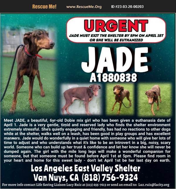 URGENT!!!! Jade will be euthanized on 4/1 at 4pm because of having FAS (fearful, anxious & scared)!!! Meet JADE, A1880838, a beautiful, 6yr-old Dobie girl who has been given a euthanasia date of April 1. Jade is a very gentle, timid and reserved lady who finds the shelter environment extremely stressful. She's quietly engaging and friendly, has had no reactions to other dogs while at the shelter, walks well on a leash, has been good in play groups and has excellent manners. Jade would do wonderfully in a quiet home with someone who will give her lots of time to adjust and who understands what it's like to be an introvert in a big, noisy, scary world. Someone who can build up her trust & confidence and let her know she will never be dumped again. The girl with the mile long legs will make a wonderful companion for someone, but that someone must be found before April 1st at 5pm. Please find room in your heart and home for this sweet lady - don't let April 1st be her last day on earth.