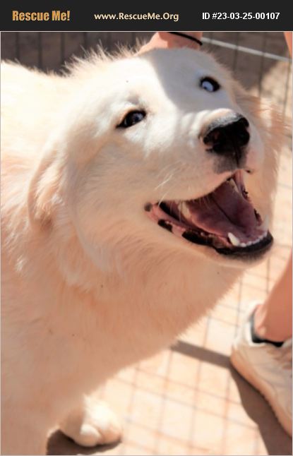 Glacier is an all white husky mix. He has one blue eye and one eye with both blue and brown. We think he is a Husky/Pyrenees mix. This is not confirmed. As a puppy he is still learning to be house trained and leash trained. He has lots of energy and will need help with training. We expect he could be a large dog based on his size and age now.