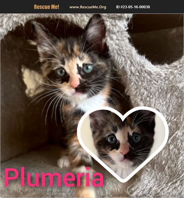 Adoptions are scheduled by appointment only after an application has been completed and approved. If you are interested in adopting, please download an adoption application from our website TORescue.org and submit over to us. Please do not visit any shelters or rescue groups before coming to ours. We do this to keep our animals healthy and prevent diseases from entering our rescue. Plumeria has beautiful markings and a wonderful personality. She is very well socialized and super affectionate. If you're interested in learning more or to adopt visit our website torescue.org to download an adoption application. Or send us a private message or email us at [email protected].��%BC All our cats/kittens come or will be spayed/neutered, current on shots, tested for FIV/Leukemia, de-wormed, and microchipped. Please stop by and meet our furry friends and see how wonderful and loving they are! The adoption fee is $125, which goes back to saving more animals from hoarding situations, dumps, abandonment, or neglect. All adoption fees are 100% tax deductible. Call us for more information at 909-267-9715 or email us at [email protected]. Our website and Facebook are TORescue.org