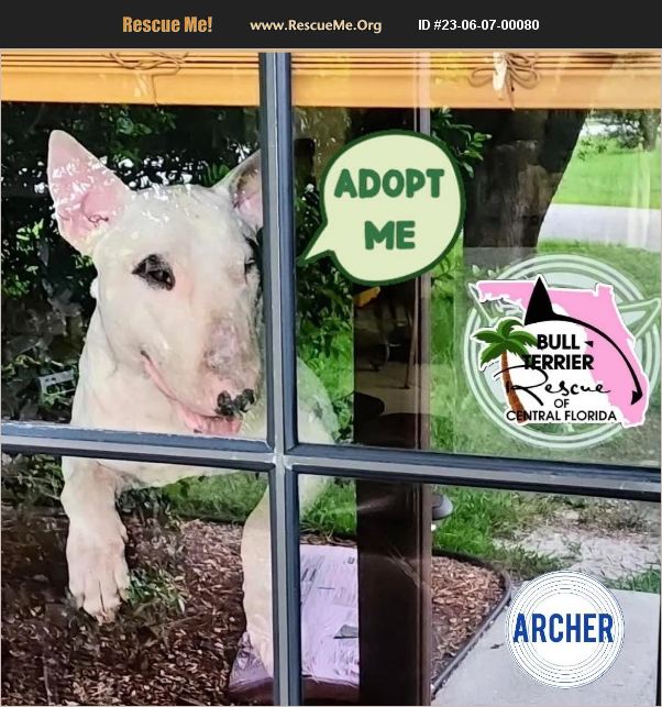 Archer is a GEM & he is doing great in his foster home! He is a velcro boy who is enjoying laying under his foster dad's desk while he works, enjoys snuggling on the couch when friends & family come over and also loves relaxing in his crate! Archer is 2-3 years old, 43 lbs, dog friendly. He is with Bull Terrier Rescue of Central FL.
