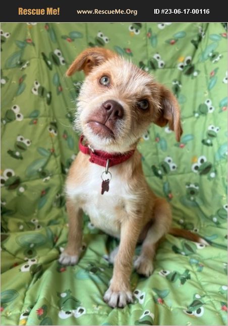 Our April Fools Baby! Froggy is a Border Terrier mix born on April 1, 2023. He is a small pup and will stay that way. His cute wire coat is ginger and white. He is good with other dogs and with children. He would make a great sidekick. He isn't housetrained, yet, but his breed is a smart one and he would train quickly with some consistent work.