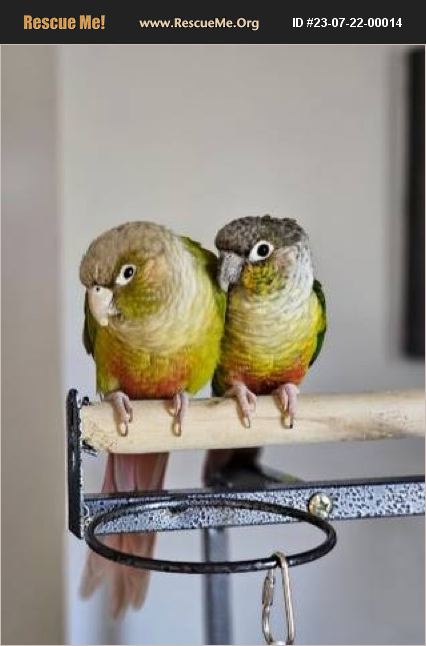 Rehoming my 2 conures to good home. One is a normal green cheek, and the other is pineapple. Pineapple is female, and regular green cheek is male. Cage is included along with what remains of their food. Series inquiries only, must pick-up.