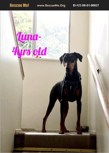 Luna is a beautiful and loving Dobermann that needs a forever home. Luna has been with one family for the last 4 years. However, her parents now need to go into a senior home and cannot take her with them. If you are looking for a loving dog who is good with kids and adults, please give Luna a home. You will not regret it.