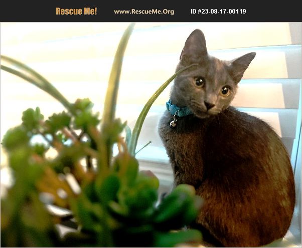 Choo Choo was found under a shed, the mother cat had abandoned her entire litter, this was the only one that was alive. We have been caring for him but unable to keep him. He is great with young kids, has been in a home with an adult female cat, and has been introduced to our dog. He loves to play and is very curious and fun to be around. Choo Choo is a Russian blue, this breed is very intelligent, playful and meant to be an indoor cat. We believe Choo Choo was born sometime in April of this year.
