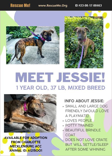 Jessie is a beautiful mixed breed with a brindle coat. Key information about Jessie: - Dog friendly (both small and large dogs) - Not cat tested but gets along well with my small catlike dogs :-) - Loves people and very affectionate - Will sleep and stay in crate when I am gone (but doesn't love it yet, some whining before she settles) - Just starting to learn commands but eager to please and treat motivated Jessie is around 10-12 months and 37 lbs. She came into the shelter with another dog and has been living with my two small dogs so she is very dog friendly. She is a little timid with new places and things but opens up every day. I have her sleeping in a crate at night - she is just learning about the crate and whines a little when entering but has been able to settle down. She is very gentle and loving and would make an excellent family dog. She has not been at all destructive and has an average energy level. Happy to play or chill.