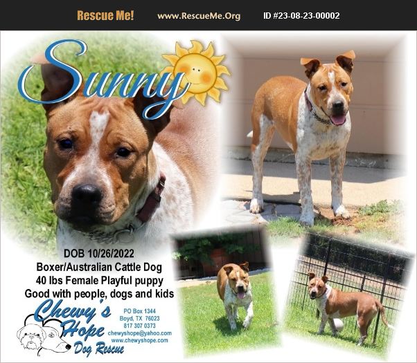 My name is Sunny. I was found abandoned in a creek bed with some issues due to poor nutrition. Chewy's Hope took one look at me and said 'we can fix that with good nutrition!' That's just what they did! I am all healthy now and can run and play with the other dogs. My foster mom says that I am so sweet & I like to be cuddled like a baby. I like to play with other dogs, and I also like those little humans, they're pretty fun to play with. If you're looking for someone to cuddle and give you kisses, I'm your girl!