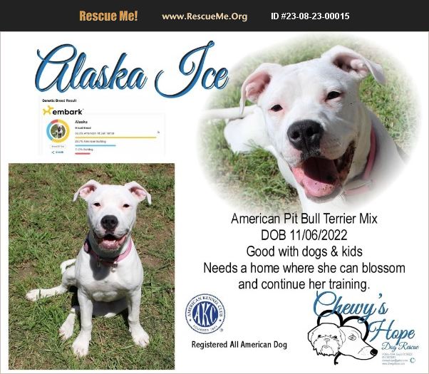 Alaska Ice is a delightful canine companion with a unique blend of American Pit Bull Terrier and American Bulldog ancestry. This smart pup has shown a remarkable intelligence and a strong desire for human interaction. One of Alaska Ice's endearing qualities is her ability to keep herself entertained, striking a balance between enjoying quality playtime with her humans and engaging in independent activities. Her sociable nature extends beyond humans, as she gets along well with dogs of all sizes, making her an excellent addition to multi-pet households. Alaska Ice is also kid-friendly, which makes her a wonderful option for families with children. Her graduation from puppy obedience classes showcases her commitment to learning and adapting to new environments. Notably, she holds the distinction of being a registered All American Dog with the AKC, and her ongoing efforts to earn a Canine Good Citizen title reflect her dedication to good behavior and manners. With her housebreaking and crate training successfully completed, Alaska Ice will be well-prepared to transition smoothly into her new forever home. And would enjoy a home where she can compete in AKC Obedience or Rally. Her blend of intelligence, sociability, and trainability makes her an ideal companion for families who value an energetic and loving four-legged friend. If you're seeking a loyal and charming addition to your household, Alaska Ice might just be the perfect match for you.
