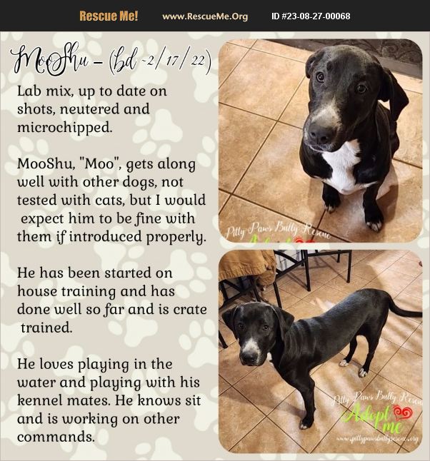 Hi! Hello! Whatcha doing? My name is MooShu but people can call me Moo for short. I'm with a Pitbull Rescue, but I'm an honorary Pitbull as my breed seems to seriously lean towards Labrador Retriever. Did you know black Labradors were actually invented before the yellow and chocolate ones? It's true. Read a book! Dog facts are cool. Did you know dogs can smell 100,000 times more better than a human? Indeed. I once smelled a turtle toot in Austin and I live all the way in Victoria! Okay, maybe that's a tall tail, but still dogs do smell better than humans. Especially on bath day! Ha. Speaking of baths, I love playing in water. I also enjoy play time with the other dogs here. I'm very friendly and outgoing. I get along with dogs. I haven't met cats, but Foster Mom thinks with proper intro, I would get along with anyone. I have started on crate training and I'm really good at it. We are also learning to do words such a SIT. *puts booty in floor*. Okay, that's a sit. Now where's my treat? I love attention and would love to be your dog. Basics: Mooshu- neutered male, Lab/Hound mix, DOB 2/17/22, large, black/white accents, vaccinated, chipped, good with dogs, good with kids, not cat tested (but would likely do okay), crate training in progress (doing well), loves water sports, playing with dogs, learning basic commands How To Adopt: Pitty Paws Bully Rescue in Victoria Texas. Website: www.pittypawsbullyrescue.org/adopt-a-bulls TEXT: 361-649-5608 Email: [email protected] (but it's faster to TEXT me) Location: Victoria Texas but transport can be arranged across the states and Canada