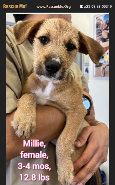 Millie is an adorable 3-4 mo old puppy. She looks like a possible schnauzer and/or cairn terrier mix. She is nonshedding. Very very sweet.