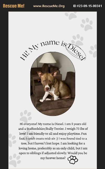Hi everyone! This is Diesel; he is a loveable pup! I came across him when I saw a post about him being on the euthanasia list at the Maricopa County Animal Shelter. He had difficulty adjusting to the kennel, as any dog would. His owner previously abandoned him, but that has not stopped his spirit; he just needs someone who won't give up on him! Please message me if you are interested in adopting him, as he is currently being fostered! He is great with kids, potty trained, and has all his shots; he just needs another chance!