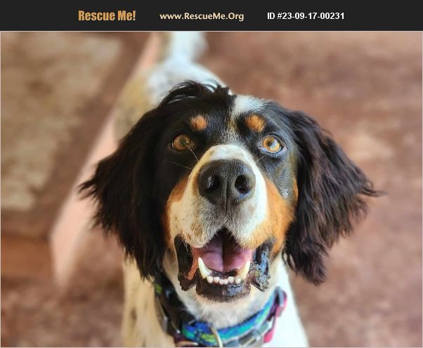 Spur is a gorgeous almost 6 year old male tri-color Setter. He is standard sized for a field Setter weighing in at a lean 54 pounds. He is FDSB registered and was whelped in Illinois. He went to Oklahoma to hunt but is heat intolerant and he came to rescue where we are happy to have him. This is Spurs' first time living in a home so he will still need to be monitored in a new environment for house training. He is crate trained and so far has loved all the dogs he has interacted with, from a small female 25 pound terrier to a 120 pound male doodle. He wants another dog buddy in the home to pal around with and that will tolerate some running kind of play. He is likely not cat safe since he shows a great deal of interest in them in the house. We're not sure how Spur is with children since there are no small children in the foster's home. He is pretty confident and so far has enjoyed meeting new people on his excursions to the vet's office. Like most Setters, he pulls on the leash when excited so he is a bit of a handful. He's a little bit nosy in the house so counters should be surfer proofed to ensure he doesn't get into something he shouldn't. Spur loves to be outside but mostly loves it when you are watching him run. And who wouldn't want to watch him? He moves like an elegant gazelle while he travels through the yard hunting out birds that might be passing through. He needs a yard with 6' fencing. Spur tolerated the heat in August by running and then jumping in the wading pool set up for him to cool off. His ideal home would likely be one that was a little cooler than Oklahoma in the summer. Spur is a beautiful boy that is also very sweet and sensitive. He likes to hunt but also likes to hang out with you and have his back rubbed. He barks usually only at meal time and has a great appetite. Spur sleeps in his crate and will jump right in there with a treat lure. He rides great in the back seat of the car and will settle down to sleep if the trip is longer than a few minutes. Spur does not seem to have a strong escape drive but like any Setter should be watched to ensure he doesn't find an outlet for escape. He is at risk for dashing out the front door so should be corralled before answering the front door. Spur is up to date on vaccinations, neutered and microchipped. He is in a foster home in Edmond, OK. Are you the furever home that this cool boy is looking for?