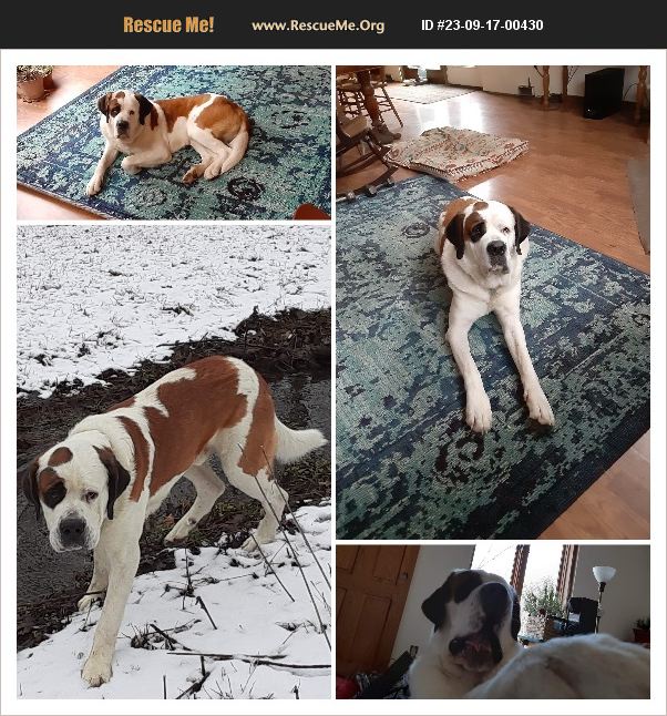 St. Bernard 7 years old, good with people not good with other dogs. Very loving inside dog. Re homing due to family home due to housing issues my home burnt down and unable to find housing that accepts large dogs. Up to date on all vacancies.