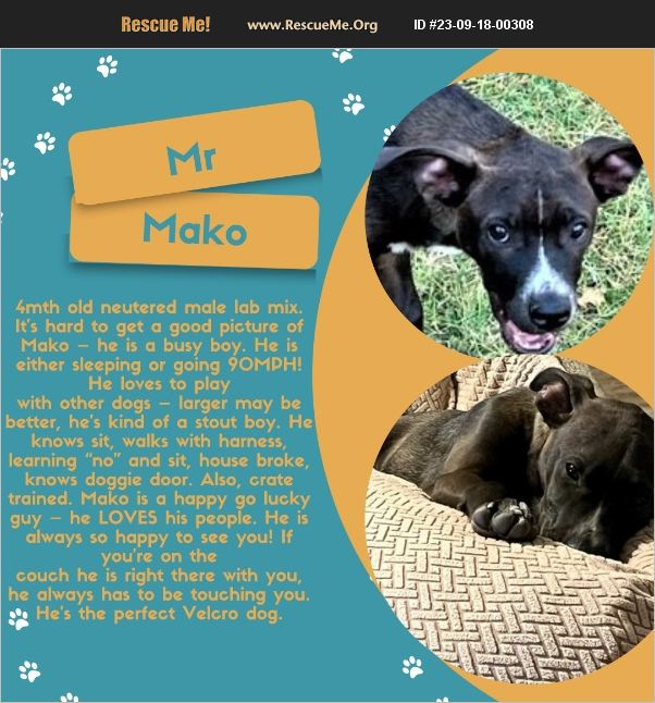 Mako loves everyone. Hes always a ball of happiness. Especially if he is with his humans. He just wants to be snuggled up with or touching you. He's crate, and potty trained. Knows the dog door. He's very energetic and would love other dogs to play with.