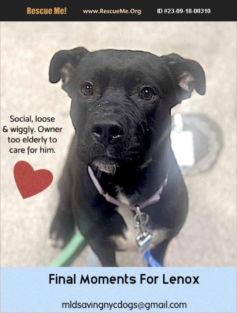 Available NY,NJ,PA,CT,DC,MD,DE,NH,RI,LI,MA,VT,ME THE BUSY BUSY SHELTER MUST'VE FORGOT ABOUT THIS POOR BOY. ��%BD��%BD��%BD��%BD He's been there since August 7th and has one really bad picture but he's Level 2. Lenox was brought in as an owner surrender because his owner is too elderly to care for such a young, spry and playful boy. Lenox is just two years old and he's a compact, lightweight forty-three pounds. To boot, he's been rated LEVEL 2. It should be against the rules to put such a good boy on such a deadly list. We understand the overcrowding and that this already chaotic environment has become even more hectic but we have to make concessions for Lenox. This little guy needs and deserves a loving home. He's loose, wiggly and social, active and eager for treats, food and love, but he's also underweight and his nails need to be trimmed. Lenox needs a safe and quiet space where he can have the time he needs to decompress, as well as time to get to know the new people/person in his life. Lenox is overwhelmed at the shelter and may need to be your one and only. LENOX@MANHATTAN ACC Lenox ID#179187, 2 years old, 43 lbs Medium Mixed Breed, Black Unaltered Male Came into shelter as a Owner Surrender Reason Stated: Elderly Owner Medical Behavior Evaluation: 1. Green Behavior Assessment Rating: LEVEL 2 INTAKE DATE: 8/7/2023 PET PROFILE: My health has been checked. My vaccinations are up to date. My worming is up to date. I have been microchipped Lenox is on emergency placement for behavior concerns. Lenox remains highly dog reactive in the care center, lunging and growling toward them during walks; he is unable to be easily refocused. Additionally, Lenox has begun to jump up and grab the leash throughout walks. Medically, Lenox has CIRDC and is underweight. Level 2 Behavior Rating: Summary: This dog may have some low-intensity behavior challenges or mild triggers, but is suitable for most adopters with some dog experience. Dogs with Level 2 determinations are believed to be suitable for adopters with some previous dog experience. They will have displayed behavior in the shelter (or have owner-reported behavior) that requires some training, behavior management or modification. Dogs with a Level 2 determination may have multiple potential challenges and these may be presenting at differing levels of intensity, so careful consideration of the behavior notes will be required for counseling. Lenox arrived to the care center as an owner surrender. His previous owner mentions that he will bark at strangers as well as dogs on leash. Lenox has been observed to be initially shy in the care center though has been observed to warm up and seek attention. Since intake, Lenox has been observed to display a high level of dog reactivity, lunging, growling and hard barking; he has been unable to be easily refocused. For these reasons, we recommend an experienced home environment for Lenox. *What my friends at ACC say about me: I am looking for a home with a patient person. I can be slow to adjust to new environments. I prefer to take things at my own pace. I am finding the shelter a little overwhelming, but when it's just you and me and some peace and quiet you'll see what a love bug I am. MEDICAL EXAM NOTES My medical notes are... Weight: 43 lbs Vet Notes Medical Assistant L V T Notes 8/8/2023 DVM Intake Exam Estimated age: 2 y/o based dentition Microchip noted on Intake? scan negative History: owner surrender Subjective: BARH Observed Behavior - eager for treats and food; very energetic active Is there evidence of Cruelty? no Is there evidence of Neglect? no Is there evidence of Trauma? no Objective T = not taken P = wnl R = wnl BCS 3/9 EENT: Eyes clear, ears clean, no nasal or ocular discharge noted Oral Exam: no tartar or plaque on teeth, all adult dentition PLN: No enlargements noted H/L: NSR, NMA, CRT ( 2, Lungs clear, eupnic ABD: Non painful, no masses palpated U/G: 2 testes palpable in scrotum MSI: Ambulatory x 4, skin free of parasites, no masses noted, dirty malodorous coat; small patch of erythematous alopecia on lateral aspect of L hind foot; long nails CNS: Mentation appropriate - no signs of neurologic abnormalities Rectal: externally normal Assessment: Underweight Long nails Otherwise apparently healthy young intact male adult Prognosis: Good Plan: OK for intake procedures. Clipped nails *Recommend bathing. SURGERY: Okay for surgery 8/11/2023 Starting trazodone 125mg PO BID indefinitely for in shelter FAS 8/22/2023 Pet rejected from ASPCA due to coughing. He is BAR in kennel. EEN: Clear nasal discharge. No coughing during rounds. RESP: BAR A: Mild CIRDC P: Monitor 8/26/2023 Hx: Diagnosed with mild CIRDC, not on meds, moved to isolation SO: BAR, comes to kennel door wagging tail eyes clear, heavy yellow nasal dc apparent eupneic, repeated soft coughing appreciated ambulatory x4 mentation alert and appropriate A: CIRDC P: doxycycline 200mg PO SID x10d cerenia 30mg PO SID x4d recheck at end of course,