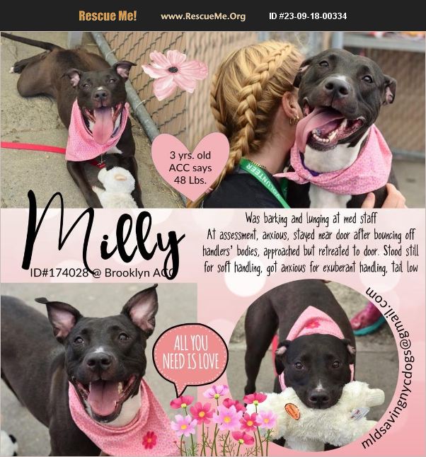 Available NY,NJ,CT,PA,DC,MD,DE,NH,RI,LI,MA,VT,ME A vivacious, young, healthy beauty by the name of Milly is in dire need of rescue at the Brooklyn ACC. This shiny princess was brought into the shelter as a stray, though quite clear she is no stray. Milly has a beaming smile which lights up her entire face, her ears merrily even join in to complete the most compelling vision! She is entirely social, playful and joyful. Love and affection are effortless with this sweet girl. Understandably she finds the shelter scary and hopeless at times, and truly dreads being locked in a tiny kennel for endless hours there. In fact, the shelter used her occasional kennel defensive fear as cause to list her for death, while noting her consistent and endless loving nature in every other environment and scenario! An utterly unacceptable decision! They will leash this girl soon for her final walk and breath, knowing full well her fine qualities, her desire to give and receive affection and her forever uplifting vibes prove her worth; it all means nothing there. Therefore we beg, and plead, please help us find this excellent doggie a foster or adopter before it is too late. If you can help this angel out, please message us now. A volunteer writes: Milly Milly Vanilly came to us as a stray. She is oh so sweet outside, but has been struggling in a small kennel. Active dogs aren't made to live in a kennel! She is about 3 years old, and is high energy and bouncing off the walls. Milly would benefit from a adult only home with people who can respect her space when she asks. Milly whispers in our ears that she hopes a new home will have lots of toys for her. She likes to bounce and run around the yard, with a big smile plastered across her face. She can be a bit all over the place, trying to find the beset way to earn her treats and playtime. Milly would be great in a home ready to provide her lots of enrichment to use her smart brain, and get her energy out. Ask to meet her today! MILLY 174028 BROOKLYN ACC Estimated to be 3 years 3 mos old, 52 Lbs UNALTERED FEMALE, MEDIUM MIXED BREED STRAY FROM NY MEDICAL BEHAVIOR EVALUATION: BEHAVIOR RATING: LEVEL 3 INTAKE DATE: 06/10/2023 PET PROFILE Stray, no known history. Behavior Notes: Upon intake, they allowed staff to place a loop rope on them. They pulled the lead very hard. When in admissions office they were very hyper, and jumpy. They jumped very close to staff members face, and they strong armed them. They allowed staff to place them into their kennel. Other Notes:: While in her crate, Milly begins growling, baring her teeth, and snarling when she has treats, toys, or food. Milly is in need of emergency placement due to behavioral concerns. While social outside of her kennel, Milly has a poor kennel presence and guards her food, treats, and toys when placed in her kennel. This is stressful for her and other neighboring dogs due to her escalating to charging the kennel door, slamming on it, while snarling, and baring her teeth when her kennel is passed or approached. Milly displays these behaviors even when she does not have an item she considers high value in her kennel. Best efforts have been made to keep Milly comfortable but she continues to display these behaviors. Medically, Milly has an umbilical hernia. What my friends at ACC say about me: Please check here for updated adoption hours. My history is a mystery and my friends here do not know much about me yet! It is unknown if I have ever lived with other animals or children. I don't always like to share my food, toys or bedding with others. I am finding the shelter a bit overwhelming. Outside one-on-one I am a great big cuddle bug. ASSESSMENT NOTES Date of assessment:: 6/11/2023 Summary:: Leash Walking Strength and pulling: Hard pulling - pressure is maintained the entire time on leash Reactivity to humans: None - ignores Reactivity to dogs: None - ignores Leash walking comments: Sociability Loose in room (15-20 seconds): enters the room with high energy, visibly anxious, stays near door after bouncing off handlers' bodies Call over: brief approach but then retreats to door Sociability comments: seeks exit Handling Soft handling: stand still, heavily panting, tense, tail low Exuberant handling: stand still, heavily panting, tense, tail low Handling comments: Arousal Jog: follows, distracted Arousal comments: Knock: no response Knock Comments: Toy: no interest Toy comments: Summary:: Due to operational limitations, dog-dog interactions have been postponed. Summary (2):: 09/11/23 Milly is standing on her kennel door with a wagging tail. As the handler unlocks the kennel door and takes down the blocker, Milly becomes wigglier. The handler leashes Milly with ease and they proceed outside with no issue. Milly displays a loose body, and a wagging tail, while playfully jumping onto the handler. Milly walks moderately beside the handler. Milly takes treats gently as the handler administers them. Milly allows touch as wel