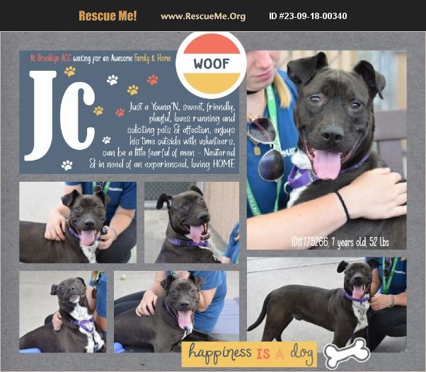 Available NY,NJ,CT,PA,DC,MD,DE,NH,RI,LI,MA,VT,ME JC IS JUST A YEAR OLD ��%BD%9D%A4 He's waiting for a calm, loving and experienced family to come snatch him up. He's ready for his happy ever after. A volunteer writes: JC is the ultimate sweetie-bo-beetie. He is a soft young boy, who deserves all the good things in the world - a giant soft bed, a family who loves him, and maybe some chicken nugs. JC's former family had taken him from a situation where he was abused by men. He can be wary of men as a result, and is generally a fearful boy. The family who saved him tried their best but could not afford his care. JC has been nervous in the busy shelter, but slowly and surely he has started to enjoy his walks, wiggling and sniffing, and if you are super lucky, he will lean against you for pets. His favorite hobbies are chewing and running, and this smarty pants is bilingual - he knows Spanish and English. When I meet JC, he doesn't show his fearful side at all. He is all about hanging out, getting some pets, and appreciating his time outside his kennel. JC would do best in a quiet home where he can decompress and have his space when he is feeling scared. JC@BROOKLYN ACC JC ID#175266, 1 year 2 ,mos 3 weeks old, 47.4 lbs Medium Mixed Breed, Dark Brown/Black NEUTERED Male Came into shelter as a Owner Surrender Reason Stated: Medical Assessment Behavior: Behavior Evaluation: Level 3 INTAKE DATE: 07/08/2023 PET PROFILE The owner's mother is making her surrender because 'JC is too loud' meaning that he barks. The owner did describe him as 'vocal' described as 'afraid of the outside' and 'afraid of everything' Previously lived with:: adults How is this dog around strangers?: He is mostly fearful of strangers. He will jump/growl at men. More distrustful of men but is respectful with women How is this dog around children?: Has not been around children How is this dog around other dogs?: He is more respectful towards older dogs but more playful with younger dogs. How is this dog around cats?: is curious about outdoor cats but has never Resource guarding:: Will growl if someone tries to touch his food or bowl while eating. 'protective' of the owner Bite history:: There was an incident where a dog got close to JC's owner. The dog placed his paws on JC's owner, and JC bit and immediately released. No blood was drawn. Housetrained:: Partially Energy level/descriptors:: reported to be high energy. Other Notes:: He had his nails trimmed to the quick and is now very fearful of nail trimmings Medical Notes: Allergies - Vet told the owner he is allergic to grass For a New Family to Know: He loves chewing and running. He is bilingual and knows English and Spanish. He loves hugs Upon intake: When JC was in ACC Lobby he was looking around the lobby at all clients. Due to another dog coming into ACC lobby staff placed a divider so that JC would not see the other dog. When vet service staff was walking from CC desk outside to assist other employees, he barked and lunged towards VS staff member, who was nowhere near JC. JC continued to bark at VS staff member through the lobby glass. When staff approached he was unsure of staff member and would come towards staff to sniff them, however when staff moved he would jump back, huff, wag his tail, and come back to sniff staff. His owners had to place a lead on them, and he was then taken to medical. My health has been checked. My vaccinations are up to date. My worming is up to date. I have been microchipped. *A Little Bit About Me* What my friends at ACC say about me: I would do best in a home with only adult humans. I prefer to call the shots and enjoy coming to you when I'm ready for pets. I would appreciate slow introductions to new people and places to help me feel safe. I really enjoy toys! I'll let you know my favorite one when we meet! I love to be loved, but on my own terms! Let's brush up on some canine body language together! I don't always like to share my food, toys or bedding with other animals. ASSESSMENT NOTES Date of assessment:: 7/27/2023 Summary:: 7/27/23: Leash Walking Strength and pulling: Mild Reactivity to humans: Inconclusive Reactivity to dogs: Inconclusive Leash walking comments: None Sociability Loose in room (15-20 seconds): Highly Social Call over: Approaches readily Sociability comments: approaches handling and jumps on them for petting, walks to both assessor and assistant Handling Soft handling: Accepts Contact Exuberant handling: Accepts Contact Handling comments: accepts petting, loose body, relaxed face Arousal Jog: Follows (loose) Arousal comments: follows jog with loose/neutral body Knock: Approaches Loose Knock Comments: Stares at door, but eventually greets person at the door with a loose body Toy: Grips, moves away Toy comments: walks behind assistant with toy 7/11/2023: Leash Walking Strength and pulling: None Reactivity to humans: None Reactivity to dogs: None Leash walking comments: None Sociability Loose in room