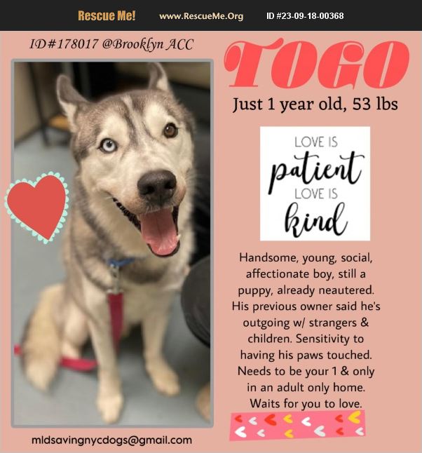 Available NY,NJ,CT,PA,DC,MD,DE,NH,RI,LI,MA,VT,ME Togo is 13 months old, and should not be fighting for his life! But thanks to his owner, he is! On top of being stunning, Togo is affectionate and social. He likes being with his people. He also loves tennis balls and belly rubs. Togo was described as social, affectionate, playful, and independent. Towards kids, he was gentle and playful. Togo likes being brushed, but not bathed. He also knows basic commands and likes car rides. But due to his fear and anxiety, ACC wants nothing more than to end his life! At only 13 months old! He is a good boy, who needs a chance! Please give him that chance before it's too late! TOGO 178017 BROOKLYN ACC Estimated to be 1 year 1 mos 3 weeks old, 53.2 Lbs NEUTERED MALE, LARGE MIXED BREED OWNER SURR FROM NY, AGGRESSIVE MEDICAL BEHAVIOR EVALUATION: BEHAVIOR RATING: NH ONLY INTAKE DATE 09/12/2023 PET PROFILE They are about 1 year and 7 months old, and was surrendered to ACC due to bite incidents within the home. Previously lived with:: 1 adult How is this dog around strangers?: They will lunge at strangers and visitors How is this dog around children?: They will lunge at children How is this dog around other dogs?: They will lunge, hard bark, growl, snap, and try to bite at familiar dogs, on and off leash. How is this dog around cats?: They will lunge, hard bark, growl, snap, and try to bite at cats Resource guarding:: They will snap and attempts to bite with treats. Bite history:: They have a bite history. They bit the owner when taken to the park to play, and bit a familiar person when their owner was talking to them. Housetrained:: Yes Energy level/descriptors:: Very High Other Notes:: They aremouth with treats, likes to jump on people, pulls hard on the leash, and chews on it. They react to bikes, dogs, cats, and small animals while on walks. They will growl, bark, attempt to bite and lunge. They are not bothered when held/restrained, pushed/pulled off furniture, if their paws are touched, or if their collar is grabbed. They have never been disturbed when resting, or startled. Other Notes:: 9/14/23: They are social, affectionate, active, playful, and independent. They like to be where the people are. They allow brushing but not bathing. They pull extremely hard on walk They love to go on car rides, and like to sit, stay, paw and come. They love belly rubs and loves their tennis balls. They like ot play with a hard bone as well. Has this dog ever had any medical issues?: No Medical Notes: N/A For a New Family to Know: They are social, affectionate, active, playful, and independent. They like to be where the people are. They do not allow anyone to touch their paws. They allow brushing but not bathing. They pull extremely hard on walks, and their walks are usually 2 hours long 3-4 times a day. They do not do well with crate training. They love to go on car rides, and like to sit, stay, paw and come. They love belly rubs and lves their tennis balls. They like ot play with a hard bone as well. Upon intake: They allowed staff to place a lead on them. Due to the bite incidents within the home. They were taken straight to their kennel. Due to the detailed behavior issues, this animal is only available for foster/adoption through one of ACC's New Hope Partners. If you are interested in adopting or fostering, please fill out the pre-screener form. This animal is not directly available for adoption through ACC and is only available by completing the pre-screener form.Adoption inquiries sent directly to ACC will not receive a response.Pre-Screener Form Togo is in need of emergency placement due to behavior concerns. During Togo's last residence, there were two biting incidents, with one resulting in broken skin. Although these bites were labeled as unprovoked, they might have occurred due to over-stimulation. In the care center, Togo appears tense and exhibits lip quivering when his paw is touched. Togo's previous owner mentioned that he is typically friendly and outgoing with strangers and children. Medically, Togo is apparently healthy. Togo was surrendered to the BACC by his owner due to a bite incident that occurred. The owner stated he was talking with the neighbor, and Togo bit out or nowhere without warning on the arm, and it drew blood. Togo is reported to resource guard his food by snapping and growling, be on leash reactive to dogs and strangers, and is uncomfortable with handling his paws. During his assessment, Togo was anxious and was uncomfortable with his paws being touched by lifting his lip slightly when handled. Togo is described as social, affectionate, active, playful, and independent. They love to go on car rides, love belly rubs and their tennis balls. As a result, we recommend Togo is placed with one of our New Hope Partners. Previous intake: Date of intake: 26-Jul-2023 Means of surrender (length of time in previous home):Owner Surrender (8 months with previous owner) Previously lived with:
