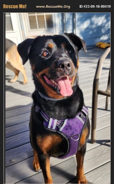 This girl is such a Pretty Penny! Great with people, including children. Gets excited with people and sometimes puts her paws on them. She has lived with other dogs, but can get over excited and play too rough with them. She resource guards high value treats, or items she considers high value and she is learning that's not acceptable. Currently with other dogs, and she is ok. We don't know how she is with cats, she may chase them. She has the rottie grumble/growl and does it often, especially when she's happy. She is housebroken, highly food motivated, knows basic commands (recall, sit, lay down, scratch- for trimming front nails on a scratch board, on your bed, wait, stay- hasn't quite mastered, outside, treat, trade- for when she finds something to guard). Walks well on a leash. A bit nervous in a car. She was abandoned as a puppy then adopted into a happy home until her owners passed away.