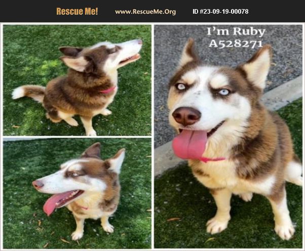 ID#A528271 I am described as a female, brown and white Siberian Husky. The shelter thinks I am about 2 years. I weigh approximately 34.00 lbs. I have been at the shelter since Sep 15, 2023 and I am available for adoption NOW! Ruby is also just 2 yrs old!