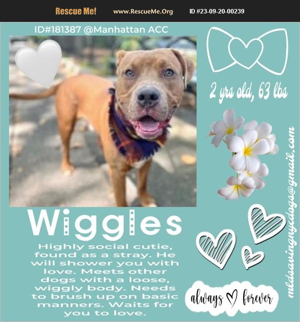 Available NY,NJ,CT,PA,DC,MD,DE,NH,RI,LI,MA,VT,ME Wiggles is pure puppy perfection. At just 2 years old, he found himself in a cage, fighting for his life when he should be living it! He is a mush for attention. When a handler was petting his head, Wiggles nudged their hand, requesting more pets. He is a dream on the leash; easily leashed and does not pull. But he does jump up socially and in a friendly manner when he sees the treat bag and then paws at it. Wiggles is a good boy and deserves the treats. Wiggles is highly social, loose, seeks contact and comes when called. And when he saw another dog at the gate, Wiggles was all loose and wiggly when he saw them. But despite all that, the ACC will stop at nothing to kill him. What rushed him to the top of the kill list was the fact that he got sick while he was there. He did earn a level 2 on his behavior assessment, and now seeks a new home! Won't you please help him get the home he deserves? WIGGLES 181387 MANHATTAN ACC Estimated to be 2 years 2 weeks old, 63 Lbs NEUTERED MALE, LARGE MIXED BREED STRAY FROM NY MEDICAL BEHAVIOR EVALUATION: BEHAVIOR RATING: LEVEL 2 INTAKE DATE 09/01/2023 PET PROFILE Stray, no known history. Wiggles is on emergency placement for medical and behavior concerns. Wiggles have begun to show signs of rapid deterioration in the care center. He is often observed to screech in his kennel as well as in the hallway and during walks, while also jumping up onto handlers in an anxious manner. Medically, Wiggles currently has pneumonia and is receiving treatment. What my friends at ACC say about me: My history is a mystery and my friends here do not know much about me yet! I have been known to shower my favorite people in love! I love getting pets and - you guessed it - snuggles! I am playful and cute! I will need daily physical activity to keep me healthy and happy! I am excitable and energetic! I will need positive outlets for my energy! Please check here for updated adoption hours. ASSESSMENT NOTES Date of assessment:: 9/2/2023 Summary:: Leash Walking Strength and pulling: Mild Reactivity to humans: None Reactivity to dogs: None Leash walking comments: Sociability Loose in room (15-20 seconds): Highly social Call over: Approaches readily, loose Sociability comments: Handling Soft handling: Seeks contact, loose Exuberant handling: Seeks contact, loose Handling comments: Arousal Jog: Follows, loose Arousal comments: Knock Knock Comments: No response Toy Toy comments: No interest Summary:: 9/2/23 When greeting another dog through the fence, Wiggles is loose and wiggly. Summary (2):: 9/9/23: Wiggles is at the front of the kennel loose and wiggly. He is easily leashed and taken outside for a street walk. He does not pull at all on the walk but will jump on handler socially, pawing at their treat pouch. He allows petting on his head and will nudge the handler's hand when they stop petting him. He does not react to other dogs but will stand in place looking at them. He is returned to the kennel without issue. Summary (3):: 9/6/23 Wiggles is jumping up high and screaming in kennel, hypersalivating. 9/5/23 Staff had reported that Wiggles redirected onto their treat pouch. Wiggles is at the front of the kennel with a loose and wiggly body. He is easily leashed and taken out of the kennel. He pulls slightly to other kennels but is not observed to cage fight or redirect. He is led out into the hallway. Handler briefly holds him in the hallway as they adjust themselves. He suddenly screams and pulls in the direction towards the driveway. He is taken on the street. During the walk he walked slowly pulling moderately to mild. He became startled at loud noises from construction and from a truck banging on the road. He recovered quickly and kept walking along. He looked up at the handler with a wiggly body and a wagging tail and allowed to be petted gently on the head. He is walked back to the shelter. He pulls very hard back into the kennel room, vocalizing and whining. He is returned to his kennel without issue. 9/3/23- Wiggles is at the front of the kennel when handler approaches. He is barking and is loose bodied. He is easily leashed, when leaving the kennel he barks at the dogs in passing and pulls towards them. When wiggles exited the room, he jump on handler with a loose body. He was taken to the yard where he pulled and jumped on handler with a loose body. He is put on a drag leash in the last pen. He sniffs around and when handler throws treats, he doesn't seem interested. When another handler passes with a dog, Wiggles gets excited and wiggly body. He becomes vocal and wags his tail. Wiggles was easy to re leash and allowed handler to remove drag leash with out issue. Handler took Wiggles on a street walk, where he wasn't pulling as much and was loose body again. When another handler past him on the street with a dog, he pulled slightly and became vocal. When walking back to his kennel, he would slightly pull and be vocal throu