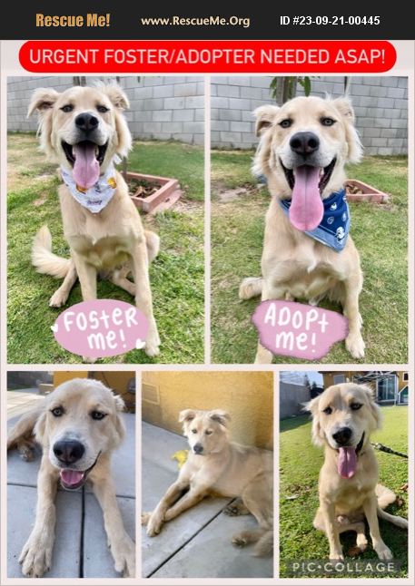 Everyone, meet this adorably joyful and absolutely stunning sweet boy named Buddy. He is a very handsome 1 yr old Golden Retriever mix. Buddy is a sweetheart! He is a true love bug!! Buddy is shy and a little standoffish when meeting new people. He will typically bark at a passerbyer or a visitor to the home, until he's had a chance to smell them, and he realizes that he is safe. He will warm up once he feels comfortable and safe. Buddy loves attention and he's very playful (he loves to play fetch and chew on his toys)!! He enjoys romping around the yard and of course delights in the indulgence of his favorite yummy treats! Buddy hasn't been around other dogs, so we're unsure how he would do with another doggy companion, however, he has never shown reactivity or aggression when seeing other dogs. Buddy has a great balance of play and fun, and he can also be calm and relax and be your snuggle buddy for some good Netflix movie time. He's a very good boy for his baths and he enjoys being brushed. And he is such a gentleman- he always crosses his front legs when he lays down. It's so cute!! Buddy loves attention and affection, and he just wants to be close to his family. He is a super special dog who needs a loving forever family. Would you be interested in opening your home and your heart to this precious sweet fellow? Please contact Jennifer with the rescue group at 714-366-8170. Adoption process needs to be 100% approved.