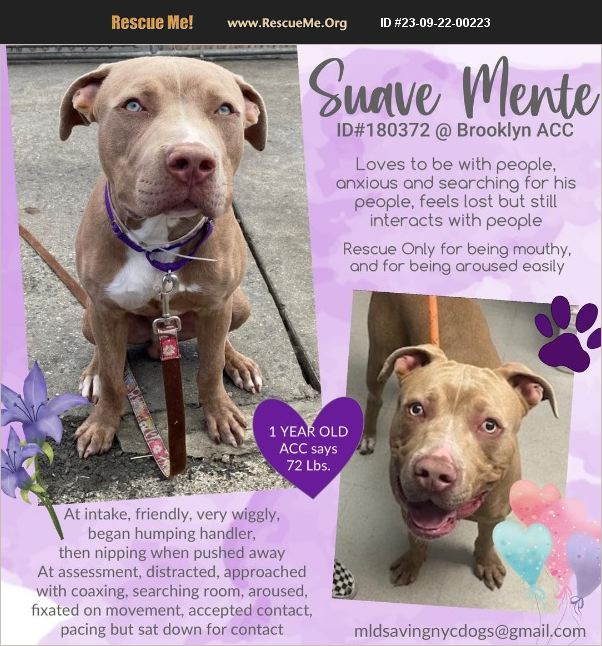 Available NY,NJ,CT,PA,DC,MD,DE,NH,RI,LI,MA,VT,ME Suavemente is only a year old, and found on the streets of Brooklyn. He is only a puppy, so please save him! A volunteer writes: More than once on our walks, passersby have commented on how beautiful Suave Mente is; but this young, sweet pup has more pressing things on his mind than his looks - like how he ended up at a shelter and, more importantly, how he's going to find a rescue group to get him out. Though feeling overwhelmed and nervous in a shelter environment, his desire for human companionship is even stronger. Greeting me in his kennel with wags and wiggles, he's ready for some attention and affection. During our initial interactions, he'd get over-aroused - jumping up on me when I'd pet him. But he may be learning that it quickly ends the fun because lately he keeps all four paws on the ground more often, choosing instead to lean into my legs and do-little wiggle dances as I scratch his back and sides and rub his cheeks. Back in his kennel, I give him a plush toy, and smile as he happily swats it around before stretching out and going to work on slowly pulling it apart. With a loving home, daily exercise, and lots of fun things to keep him busy, Suave is sure to thrive! SUAVE MENTE 180372 BROOKLYN ACC Estimated to be 13 months old, 72 Lbs UNALTERED MALE, LARGE MIXED BREED STRAY FROM NY 11208 (found Nearest Cross Street:Linden Blvd/Drew St.) MEDICAL BEHAVIOR EVALUATION: BEHAVIOR RATING: NH ONLY INTAKE DATE: 08/20/2023 PET PROFILE During intake he was panting and moving around the office a lot. He was easily collared, a photo was taken, and was scanned with no issues. He noticed the net in the corner and became fixated on it. Staff had to remove the nets from the room and once tension was loosened on his leash, he ran towards the corner. He would occasionally side eye and hard stare. At a point, a staff member dropped an item and he became fixated on it. We needed to distract him by moving him towards the door. He began to pant more and was unable to settle so he was taken straight into his kennel. Basic Information:: Suave Mente s a tan male dog that was found wandering loose on the street and was brought to ACC as a stray. ASSESSMENT NOTES Date of intake:: 8/20/2023 Means of surrender (length of time in previous home):: Stray, no prior history Date of assessment:: 8/21/2023 Summary:: Leash Walking Strength and pulling: Hard Reactivity to humans: None Reactivity to dogs: None Leash walking comments: None Sociability Loose in room (15-20 seconds): Distracted Call over: Approaches with coaxing Sociability comments: Aroused, frantically searching room, easily fixated on movement Handling Soft handling: Accepts contact Exuberant handling: Accepts contact Handling comments: pacing constantly, sat down for petting Arousal Jog: Follows (exuberantly) Arousal comments: Jumps on handler, tries to mount, leash bites Knock: No response Knock Comments: None Toy: Grips, moves away Toy comments: Slightly tense, moves away with toy Summary:: Due to operation limitations, dog-to-dog introductions are postponed. Summary (2):: 9/21/23: Suave Mente was observed yanking on his kennel blocker, banging against his kennel door, and screeching when the room was empty. 09/19/23 Behavior remains the same. When leashing, Suave will bite at the leash but not tug. Suave enters and exits the building with no issue. Suave takes treats gently and allows touch. Summary (3):: 09/12/23 When the handler approaches the kennel, Suave mente is vocalizing at the handler with a loose body and wagging tail. The handler unlocks the kennel and as they place it on the kennel door, Suave jumps and attempts to bite the lock. The handler proceeds to leash Suave with ease, heading outside for a walk. Suave maintains his loose body while walking moderately beside the handler. Suave sits on his own when he wants a treat, taking them gently when administered. The handler pets Suave which he allows. Suave will muzzle touch the handler's treat pouch during the walk. The handler returns Suave back to the facility where he enters the building and his kennel with no issue. 09/05/23 As the handler approaches the kennel, Suave is lying down neutrally. He calmly rises as the handler unlocks the kennel door. Suave is leashed with ease and they proceed outside for a walk. Suave maintains a still, neutral posture as he prances moderately beside the handler. Suave takes treats gently when administered and will catch them when tossed. The handler pets Suave which he allows, leaning in for more. The handler returns Suave back to the facility where he enters the building and his kennel with no issue. 09/01/23 When the handler approaches the kennel, Suave is standing still with a gentle tail wag. The handler leashes Suave with ease and they proceed outside for a walk. Suave displays a looser body, and more of a wagging tail, all while walking moderately beside the handler. Suave takes treats gentl