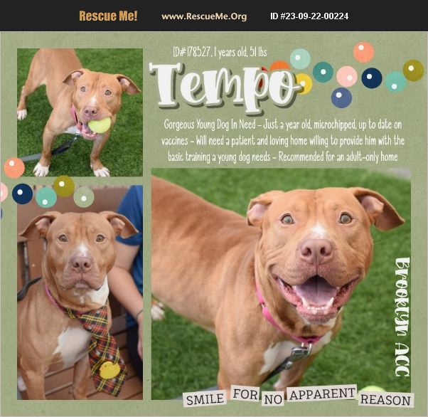 Available NY,NJ,CT,PA,DC,MD,DE,NH,RI,LI,MA,VT,ME GORGEOUS TEMPO IS JUST A YEAR OLD AND WAITING FOR A LOVING HOME WHERE HE CAN THRIVE. Tempo's story is sad. He was found tied up to a pole, on a hot day in July, where he was understandably scared. The person who found him built him a little cardboard house, as well as provided him with food and water. Then Tempo was taken away by the ACO staff, where he sits in a cage, hoping he can find love and happiness. Although he was slow to warm up to staff, he does like treats and a soft, slow approach. Tempo liked playing fetch and with toys with a volunteer and he especially loved watermelon. What he'd love even more, though, is a loving home and family. Please be the one to give Tempo a new rhyme and rhythm to his life! Save him and love him furever! A volunteer writes: Tempo was found tied up, scared, overnight. When someone found him, they built him a little cardboard house, and gave him food and water until the ACC rescue team was able to pick him up. Understandably, Tempo was nervous after all he had bean through. He has been slow to warm up to staff members, but does appreciate treats and a slow, soft approach. He is a little guy, with little legs. He is definitely interested in toys, and after a few practice rounds he becomes a fetch master. He scoots his little body into our laps once he is comfortable, chomps on some watermelon. We hope to help Tempo upgrade from his cardboard box shelter into a real home! TEMPO@BROOKLYN ACC Tempo ID#178527, 1 year 1 mos 3 weeks old, 53 Lbs Medium Mixed Breed, Brown/White Unaltered Male Came into shelter as a ACO Zip Code: BROOKLYN NY 11208 Medical Behavior Evaluation: 4. Orange Behavior Rating: LEVEL 4 INTAKE DATE: 07/29/2023 PET PROFILE: Stray, no known history, My health has been checked. My vaccinations are up to date. My worming is up to date. I have been microchipped. *A Little Bit About Me* What my friends at ACC say about me: Please check here for updated adoption hours. My history is a mystery and my friends here do not know much about me yet! It is unknown if I have ever lived with other animals or children. I'm sensitive and shy. I'll need extra help from you. I would do best in a home with only adult humans. Upon arrival ARS was able to put leash over the dogs neck and walked dog to van with no issues. Dog is slightly fearful but overall ok. No other information available as the dog was left tied to a pole. Tempo is in need of emergency placement due to behavioral concerns. Tempo was initially fearful and avoidant of touch and most forms of interaction other than being offered treats. He has warmed up to select handlers and caretakers but remains uncomfortable when presented with novel situations. Due to the length of stay, Tempo has also begun to leash bite. Medically, Tempo recently recovered from CIRDC. What my friends at ACC say about me: My history is a mystery and my friends here do not know much about me yet! It is unknown if I have ever lived with other animals or children. I'm sensitive and shy. I'll need extra help from you. I would do best in a home with only adult humans. Please check here for updated adoption hours. ASSESSMENT NOTES Date of assessment:: 8/1/2023 Summary:: Tempo has been fearful in the care center and slow to warm to staff. The below behavioral assessment is not a complete list of the behaviors he may display. Leash Walking Strength and pulling: None Reactivity to humans: None Reactivity to dogs: None Leash walking comments: None Sociability Loose in room (15-20 seconds): Moderately social Call over: Approaches with coaxing Sociability comments: Explores room, tail alternating between wagging and low, takes treats but does not solicit contact Handling Soft handling: Fearful Exuberant handling: Fearful Handling comments: Tense, whale eye, leans in briefly when handler scratches base of tail before tensing again Arousal Jog: Follows (low, fearful) Arousal comments: None Knock: No response Knock Comments: Ignores Toy: No response Toy comments: Ignores Summary (2):: 9/21/23: Tempo is jumping up and down in her kennel when handler approaches. She is frantic and overexcited when she comes out, pulling and spinning on leash. Tempo is led to the play yard where she is placed on a drag leash. Tempo is mildly difficult to leash due to her wiggling. She is leashed and let into the next pen where there is a variety of enrichment set up. Tempo engages readily with the enrichment, but does not work to access anything not readily available. She and handler walk towards the mat where they work on relaxation protocol. Tempo is able to sit, but does not lay down. She pulls hard returning to kennel and enters the kennel readily. 9/6/23: Tempo is standing neutrally in his kennel when the handler approaches. He is easily leashed and led to the assessment room. Tempo moves slowly, coughing almost constantly, until he brings up a small amount of clear discharge. Tempo is moved for