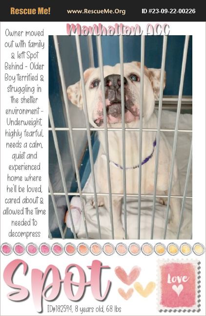 Available NY,NJ,CT,PA,DC,MD,DE,NH,RI,LI,MA,VT,ME EIGHT YEAR OLD SPOT WAS LEFT BEHIND IN THE HOUSE when his owner packed the family up and moved out. We can't even fathom the fear and confusion this senior boy must've felt as they closed that door on him; then the heartbreak that set in as minutes became hours and hours became days, and that empty space gradually became void of the familiar smells of his so-called family and the sound of their chatter and laughter. This has got to be one of the coldest, most callous things we have seen here. Needless to say, Spot is not doing well at the shelter. He's frustrated and scared and he's not trying to hide it. He needs a place to recover from the heartache, a safe space where he can unwind from this harrowing loss. Spot needs an experienced hero to open their heart and home and reassure him that everything is going to be just fine and give him the time and comfort needed to understand he's in good hands. This can never happen to Spot again. SPOT@MANHATTAN ACC Spot ID#182594, 8 years old, 68 lbs Large Mixed Breed, White Unaltered Male Came into shelter as a Agency/Stray Medical Behavior Evaluation: 4. Orange Behavior Evaluation Rating: NHO INTAKE DATE: 9/15/2023 PET PROFILE: My health has been checked. My vaccinations are up to date. My worming is up to date. I have been microchipped Spot is on emergency placement for behavioral reasons. He often growls or bares teeth when the kennel is approached and has not allowed handling. Medically, he has fleas and is underweight. Spot arrived to ACC as a stray with no history. He has appeared fearful within our care and has escalated to growling or snapping when attempts are made to handle or remove him from his kennel. We recommend a quiet environment in an experienced, adult-only residence to allow Spot a chance at decompression. He should be placed under the supervision of an ACC-approved rescue partner. My medical notes are... Weight: 68.6 lbs Vet Notes 9/16/2023 DVM Intake Exam Estimated age: 8y Microchip noted on Intake? scanned negative History: Police were called to remove dog from home after owner left with family. Subjective: BAR Observed Behavior - Tense at back of kennel growling. Elected sedation 0.45ml dexmedetomidine 500mcg/ml, 0.3ml ketamine 100mg/ml, 0.45ml butorphanol 10mg/ml IM, needed additional 0.1ml of each above. Evidence of Cruelty seen -no Evidence of Neglect seen-no Evidence of Trauma seen -no Objective T = P =wnl R =wnl BCS 4/9 EENT: Eyes clear, ears clean, no nasal or ocular discharge noted Oral Exam: muzzle in place, but appears to have adult dentition with moderate staining PLN: No enlargements noted H/L: NR, NMA, Lungs clear, eupneic ABD: Non painful, no masses palpated U/G: male intact, 2 scrotal testes MSI: Ambulatory x 4, heavy flea burden, no masses noted, generalized partial alopecia, dart wound on back CNS: Mentation appropriate - no signs of neurologic abnormalities Rectal: normal external Wood's Lamp Exam: not performed Assessment fleas under weight dart in back Prognosis: good Plan: intake tasks capstar 57mg tablet administered rectally needs behavior assessment Trazodone 275mg PO BID indefinitely for in shelter FAS neuter SURGERY: Okay for surgery 9/21/2023 Adding gabapentin 600mg PO BID indefinitely for in kennel FAS Details on my behavior are... Behavior Condition: 4. Orange BEHAVIOR ASSESSMENT: Date of intake: 9/15/2023 Spay/Neuter status: No Means of surrender (length of time in previous home): Stray, no history Other Notes: *Reported to have been growling at intaking officers* Date of assessment: 9/18/2023 Summary: In the care center, Spot remains fearful and has escalated to growling, lunging, or baring teeth when the kennel is approached. At this time he is not a candidate to receive a handling assessment. Summary: Unable to be conducted due to behavior. Summary (7): ent 9/18/23: Spot's kennel is covered with a sheet when handler approaches him. He begins to low growl when handler reaches for the sheet. Once the sheet is uncovered, Spot charges the front growling, baring teeth and snapping at the kennel bars. Interaction is ended due to escalation. Date of intake: 9/15/2023 Date of initial: 9/16/2023 Summary: Growling, sedated ENERGY LEVEL: Unknown BEHAVIOR DETERMINATION: New Hope Only Recommendations: Place with a New Hope partner, No children (under 13). Recommendations comments: No children: Due to fearfulness and potential for escalation we recommend an adult only home. PLACE WITH A NEW HOPE PARTNER We recommend placement with a New Hope rescue partner who is able to provide an experienced, adult-only foster home. Force-free, reward based training and/or consultation with a professional trainer/behaviorist is highly recommended. Potential challenges: Fearful/potential for defensive aggression Potential challenges comments: Fearful/potential for defensive aggression: Spot has been fearful within the care center, escalating to growling or snap