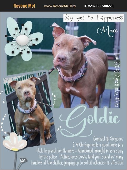 Available NY,NJ,CT,PA,DC,MD,DE,NH,RI,LI,MA,VT,ME TWO YEAR OLD GIRL whose playful and social and excited about making friends, even though she has lost everything she ever knew; from her family to her home to her doggy bed and a few old chew toys and shredded stuffies. Goldie is a beautiful and resilient pup in need of an adoring family brimming with love for her and her well being. She's young and excitable with a low threshold and escalates to jumping up and mouthing. So she'll need some help honing her manners. Goldie means no harm. She just needs to be taught by a consistent and caring family. This gorgeous gorgeous girl is out of time at the Manhattan shelter and she's been added to the kill list where she will die if no one comes for her. Goldie is looking to celebrate her 3rd birthday around the time we'll be ringing in the New Year. She'd love nothing more than to start out 2024 with a Milkbone-shaped doggy birthday cake and the promise that she is home and she's there to stay! GOLDIE@MANHATTAN ACC Goldie ID#182049, 2 yrs 8 mths, 45 lbs Medium Mixed Breed, Brown Unaltered Female Came into shelter as a Agency/Stray Medical Behavior Evaluation: 2. Blue Behavior Evaluation Rating: NHO INTAKE DATE: 9/10/2023 PET PROFILE: My health has been checked. My vaccinations are up to date. My worming is up to date. I have been microchipped Madre (Goldie) is on emergency placement for behavioral reasons. She has been observed to have a low threshold for arousal and has escalated to snapping. Medically, she is apparently healthy. Goldie arrived to ACC with no known history. She has appeared social with many handlers, often jumping up or mouthing when excited. Goldie has been observed to have a low threshold for arousal and may become tense, jump up, or escalate to snapping when overstimulated. We recommend further placement into an experienced, adult-only home with access to additional training or behavior resources to help Goldie properly manage her energy or arousal levels. My medical notes are... Weight: 45 lbs Vet Notes 9/10/2023 DVM Intake Exam Estimated age: 2-3 years based on the condition of teeth and eyes Microchip noted on Intake? Negative History: Brought in by the police Subjective: BAR H pink 1 sec Observed Behavior - high energy; social; likes treats Evidence of Cruelty seen - No Evidence of Trauma seen - No Evidence of Neglect- No Objective P = 120hr R = 40rr BCS 4/9 EENT: Eyes clear, ears clean, no nasal or ocular discharge noted Oral Exam: NSF PLN: No enlargements noted H/L: NSR, NMA, CRT ( 2, Lungs clear, eupneic ABD: Non painful, no masses palpated U/G: FI MSI: Ambulatory x 4, skin free of parasites, no masses noted, healthy hair coat CNS: Mentation appropriate - no signs of neurologic abnormalities Assessment Apparently healthy Prognosis: Good Plan: Intake procedures SURGERY: Okay for surgery 9/21/2023 Starting trazodone 150mg PO BID indefinitely for in shelter FAS Details on my behavior are... Behavior Condition: 2. Blue BEHAVIOR ASSESSMENT: Date of intake: 9/10/2023 Spay/Neuter status: No Means of surrender (length of time in previous home): Stray Date of assessment: 9/13/2023 Summary: Leash Walking Strength and pulling: Hard Reactivity to humans: None Reactivity to dogs: None Leash walking comments: Sociability Loose in room (15-20 seconds): Highly social Call over: Approaches readily Sociability comments: Jumping up high, panting, mouths light-moderate pressure, becomes anxious at times and paces room Soft handling: Over-aroused Exuberant handling: Over-aroused Comments: Difficult to position, jumps up high, mouthing, constantly in motion Arousal Jog comments: Dog snaps; initially follows, loose, on last lap becomes tense, jumps up and snaps toward assessor; no contact is made Knock Knock comments: Approaches, exuberant, jumps up high Toy Toy comments: Firm grip, loose Summary: GATE GREET 9/13/23 Slightly tense, hackles raised Summary (6): 9/21/23 Goldie was reported to attempt to grab the leash when a handler was attempting to remove from kennel. A different handler was able to successfully leash Goldie using treats. Summary (7): 9/21/23: Goldie slowly comes to the front when handler approaches with neutral body. She takes treats through the bars and is then easily leashed. In the yard, she is subdued and coughing at times. She takes treats with a hard mouth. She remains neutral body throughout. When returning to kennel, handler tosses in a handful of treats which Goldie follows in and leash in removed. 9/15/23 ACS report that when returning Goldie to kennel she spins around quickly and begins to tug the leash hard into kennel. 9/14/23: When an ACS was returning Goldie to her kennel after a walk, Goldie grabbed the leash and tugged at it. She would not relinquish the leash until another handler squeaked a toy. She let go of the leash long enough for the original handler to remove the leash from kennel. 9/13/23 When approaching Goldie in kennel, she is jumping u