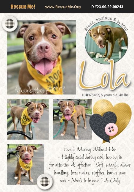Available NY,NJ,CT,PA,DC,MD,DE,NH,RI,LI,MA,VT,ME Introducing the LOVELY LOLA! The doggie doing everything wonderfully with pizazz! Lola's adorably fetching face is without a doubt immediately noticeable. It's hard to even stand the cuteness of her, between her loving eyes, button nose and loving smile. She also wears 4 white toe tips which beautifully highlight her cocoa colored coat. At the shelter she greeted everyone, cooperated with all tasks, allowed staff to pick her up and put her into a kennel, breezed through medical with vaccines and all! Her prior home noted she does great with kids, very respectful, friendly to adults, can be exuberant when engaged in play. She did live with a similarly sized male dog which she wasn't always the biggest fan of, but still endured. Described as outgoing, highly social, affectionate, playful, and respectful. Lola has no bite history, and no resource guarding issues. Allowing all handling, including nail trimming, bathing and brushing. She will bark when a stranger or visitor approaches the home-good girl! Lola enjoys all playtime, with all toys and game activities. She follows her loved ones around, wanting to be a part of everything. Trained in several commands! While being surrendered to the shelter, she was calm, appropriate, and relaxed, friendly to all! Lola is a soft, happy, wiggly and super friendly girl, she allows all handling, including muzzling. She is most deserving of the best home! If you love her as we do and want to make her your own, please message us now! A staff member writes: Lola is so much love in such a small package that she wiggles to show how little she can contain the love! She is a lovebug through and through and wants absolutely nothing more in the world then to hang out with you and to play. She has a lot of happy excited energy and would do best with a home that has the time and energy to help her spend that energy doing something healthy. Shes got the cutest little button nose and soft velvet ears. She leans in for some full body pets and massages. We go on a nice walk and then hang out in the backyard where she firmly plops herself into my lap and relaxes as she sunbathes. She is an absolute sweetheart and has never seemingly met a stranger as she greets everyone like a long-lost friend. Come meet her at the Manhattan Animal Care Center today! LOLA@MANHATTAN ACC Lola ID#176737, Estimated to be 5 years 2 mos 1 week old, 44.5 Lbs Medium Mixed Breed, Brown/White - Unaltered Female Came into shelter as a Owner Surrender Reason Stated: MOVING - Pets Not Allowed Medical Behavior Evaluation: Behavior Rating: LEVEL 3 INTAKE DATE 07/11/2023 PET PROFILE Previously lived with:: Adults, children, and another dog How is this dog around strangers?: Lola can be shy for a few minutes before warming up but mostly she is relaxed an outgoing with anyone she meets. When she plays with adults, she gets very excited and the play can be a little rough. How is this dog around children?: Lola is relaxed and playful around children. She is respectful of their space. When they play, it can range from gentle play to exuberant play. How is this dog around other dogs?: Lola has previously lived with another MMB dog who was male. They did not get along well and their relationship was described as aggressive. It also says they played together but it was rough play. How is this dog around cats?: Lola has no experience around cats. Resource guarding:: Lola isn't bothered by her food, bowl, toys, treats, or chew bones are taken away from her. Bite history:: Lola has never bitten a human or another animal. Housetrained:: Partially Energy level/descriptors:: Lola is described as having a very high level of activity. Other Notes:: Lola isn't bothered by being pushed or pulled off furniture or by being held/restrained. She is friendly when getting a bath, being brushed, and getting her nails cut. She will bark and growl to alert you if a stranger is approaching your family, house, or yard. Has this dog ever had any medical issues?: No Medical Notes: Upon intake, no medical issues were disclosed. For a New Family to Know: Lola's favorite activities of all time are going for a walk and playing catch with a toy or ball. She likes playing game such as tug, fetch, chase, wrestling, and alerting. Her favorite toys are balls, stuffies, squeaky toys, and chews/bones. When home together, she will follow you around to be a part of what's going on. She hasn't been crate trained but she does know several commands including sit, down, and shake. INTAKE BEHAVIOR: Lola was very friendly upon intake. She was calm and relaxed even during vaccination. She allowed me to pick her up and place her into a top kennel without any fear. She was overall too wiggly for me to get anything but a blurry photo. Lola is on emergency placement for behavior concerns. Though she has been social with handlers in care, Lola has been becoming highly anxious while in kennel and appears at