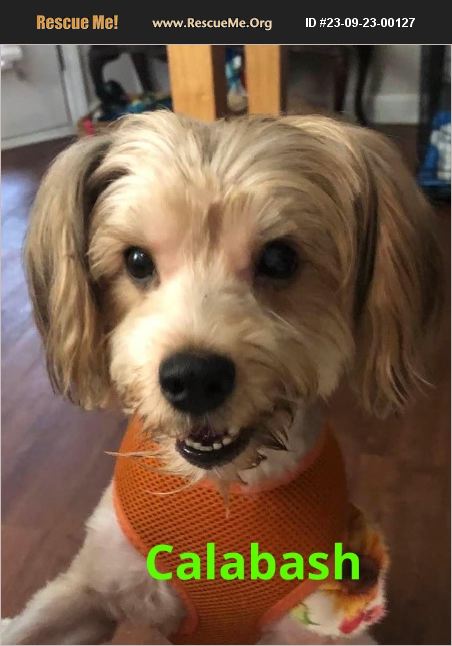 Calabash is a 5 year old male weighing 15 lbs. Good with other dogs, crate trained as he's been in crate a lot from previous owner. Very skittish & scared but Loves to be rubbed, sweet boy!