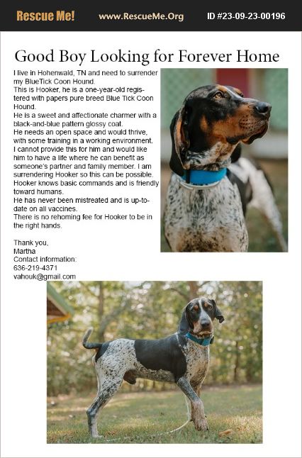 I live in Hohenwald, TN and need to surrender my BlueTick Coon Hound. This is Hooker, he is a one-year-old registered with papers pure breed Blue Tick Coon Hound. He is a sweet and affectionate charmer with a black-and-blue pattern glossy coat. He needs an open space and would thrive, with some training in a working environment. I cannot provide this for him and would like him to have a life where he can benefit as someone's partner and family member. I am surrendering Hooker so this can be possible. Hooker knows basic commands and is friendly toward humans. He has never been mistreated and is up-to-date on all vaccines. There is no rehoming fee for Hooker to be in the right hands. Thank you, Martha Contact information: 636-219-4371 [email protected]