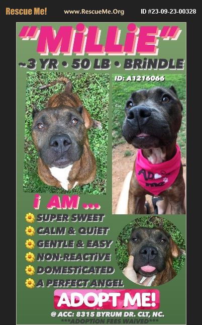 Millie's is such a special dog!! She is a perfect ANGEL!! She once had an owner (cropped ears & very well behaved inside) whom she somehow got lost from & wound up at ACC with wounds on her forehead, elbows, paws �'�|. She also contracted kennel cough so was held in TEMP kennels for quite some time (which is an area non accessible to the public due to contagious)�'�|.she will be medically cleared from that on monday so we have her on the books for spay 9/26�'�|shelter is over capacity which made her URGENT bc she is heartworm positive so i pulled her today to give her a chance bc shes a really great dog!! the shelter will provide all of her heartworm treatment, for FREE!! Adoption fees are ALSO waived until the end of the year!! She will be available for staycations (which is a 5 day trial with you in your home) after her spay is finished. Shes petite in stature but has a longer body�'�| slim but muscular build�'�|beautiful golden eyes�'�|. She makes & maintains excellent eye contact & connects easily with both adults & kids! Unknown about cats�'�|. Appears dog friendly with my resident dog (but mine is territorial & picks fights so i have to keep them separate)�'�|. Knows 'sit' & 'catch'�'�|.. wants to climb in your lap to snuggle and nuzzle her nose on you! She is super gentle & sweet!! House broken & quiet, easy in the car!