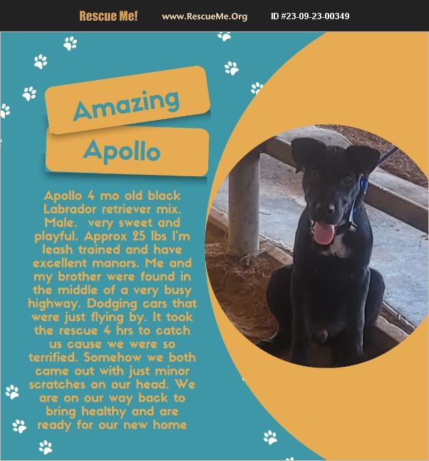 Apollo 5mo old black Labrador retriever mix. Male. Zeus. 4 mo old black Labrador retriever mix. Male He weighs about 35 lbs. He is going to be a big guy when full grown. He loves to play fetch, walks on a leash, is crate and potty trained. and knows sit. He is happy and content puppy. He can be a little shy. He loves playing with his brother Apollo. He is very smart and and motivated to learn new things. Was found in the middle of a very busy highway. Dodging cars that were just flying by. It took the rescue 4 hrs to catch us cause we were so terrified. Somehow we both came out with just minor scratches on our head. We are on our way back to bring healthy and are ready for our new home Adoption fee is $300 It includes the neuter, first year of vaccines, deworming, and microchip