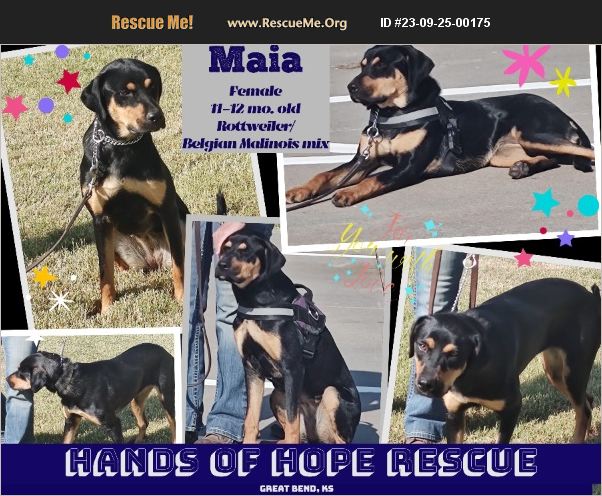Meet the stunning Maia! She is a 11 month old Rottie/Malinois mix.. She's an amazing girl that will need a person that understands large breed dogs. She's smart as a whip and learns fast. She has done a class with a trainer and did beautifully. She will be a great addition to any active family that has room for her to exercise, fence is preferred. She also is in a foster home with many and does well with dogs of all sizes! She does well in the crate and no accidents in her foster home. Maia is spayed, current on all vaccinations, microchipped and on monthly preventatives. To apply to adopt Maia visit our website for an online application at www.handsofhoperescue.com. NO PHONE CALLS PLEASE
