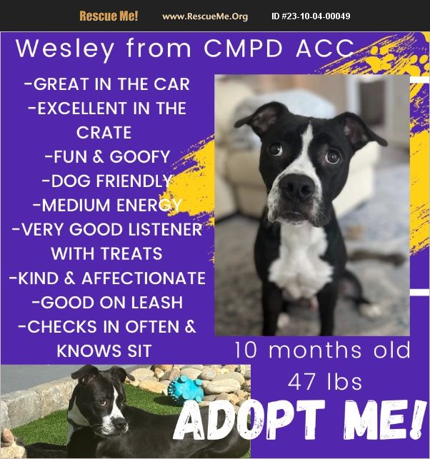 Puppy energy Playful Sweet and cute! Takes treats gently Loves belly rubs -Loves to roll around in grass and lay in the shade - Very affectionate If you want a young dog who is ready to learn your lifestyle, sweet and crate-trained with the perfect energy level and so much love to give, look no further! Anyone who meets Wesley automatically exclaims 'Aw he is adorable!' He is the definitions of a fun & loving pup. With a goofy run and always being happy to see you, he is sure to brighten anyone's life. He may be listed as 9 months old but his soul is that of an older dog. He is wise and intuitive, knowing when to be calm and constantly checks in with his person, he is eager to please. He will for do anything for a belly rub and constantly flops at your feet or in your arms for some cuddles. He loves playing with toys and will quietly keep himself entertained with a stuffed animal that he tosses to himself or gnaws on a bone at your feet. Since he has been in foster, he hasn't made a peep. Wesley easily crates and doesn't make a sound all night. His coat is super sleek and shiny. He sits on command and is quickly learning the sit/stay trick. He can be a puppy play style with doggie friends and needs to work on his playing manners. This shouldn't be a hard task as he is a very fast learner. He plays with the dogs and then comes back to check in with his person. Being that he is so young, he is very malleable & trainable to any type of lifestyle. His is quite calm for a dog of 9 months and his energy is medium. He is perfectly content just relaxing chewing a bone or playing in the yard. Because he is a young pup who is just learning how to control his gangly legs, he sometimes doesn't realize his body and will accidentally bump into small children. This is absolutely a workable skill that can be easily trained to avoid once he learns that he needs to be careful. He is interested in cats and would benefit from learning that they don't want to play for him. Again, this is completely trainable, he is a new life that needs to learn the ropes of what is expected from him. A few treats and he will be eager to do whatever his human wants from him (as long as there is food and cuddles involved!) After being overlooked in the shelter for 1.5 months, this gentle soul is deserving of a home. We promise he will repay you by being the best boy in the world! Learn more at: https://24petconnect.com/CLTAdopt/Details/CHRL/A1215155