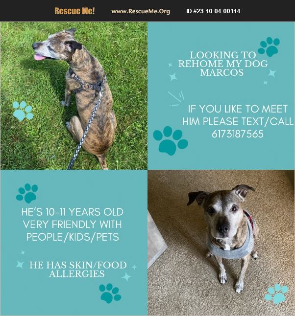 I had Marcos for roughly 10-11 years since he was a puppy I found out I was allergic to him when he was 5-7 years and it was hard to let him go at that time but my health is getting worse with my asthma and allergies from him. I like to rehome him to a better home ideally with kids because he's very friendly and playful. He's also good with other dogs and pets. He has skin/food allergies it's manageable with supplements, vitamins and being on a diet.