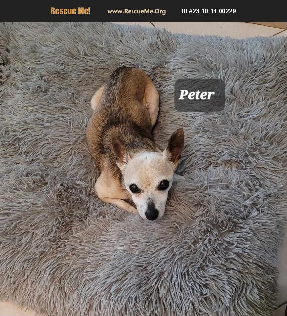 Peter was rescued from a kill shelter on the day he was scheduled to be euthanized. He was very fearful in the shelter and could not be handled He never gave us a problem. We took Peter into our home to foster. He is a sweet senior dog that bonded to us quickly. He is very insecure and needs to see or know where we are at all times. Peter is housebroken but will have an accident if he is not let out in time. Luckily our back yard is easily accessible to him and he will let us know when he needs to relieve himself, which is several times a day. Peter does not do well with steps, his body and back legs are stiff. He cannot lift his back legs. Peter is frightened of large dogs, but is fine with dogs his size. He is not good with cats or small animals that he can chase and bark at. Peter is not in any danger and can stay with us, unless there is someone that is a good fit for him and he is comfortable in a new home. Adoption fee to be discussed.