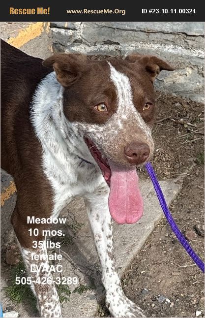 Meadow is shy but very sweet. She is crate trained and walks very well on a leash. She loves to play with other dogs and go for walks with our staff and volunteers.