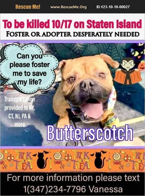 This post is going out with a pray that one special angel will see this and save sweet Butterscotch . Butterscotch is to be killed 10/17, Tuesday, at the Staten Island ACC, HIGH KILL shelter. The shelter is filled to capacity and this sweet boy will be killed due to shelter overcrowding If you're interested in fostering or adopting, please contact Vanessa Marie and she can assist with the process. Please...let's get him safe! �٪%8F BUTTERSCOTCH - ID# 184090 5 Yrs old. 47 Lbs of sweetness Adorable mixed breed Bulldog He loves to play with tennis ��Z%BE balls Butterscotch loves pets & snuggles Micro chipped & up to date on shots Butterscotch will be neutered prior to leaving the shelter He will need a slow introduction to other dogs Please text Kat 516 457-3678 if you can foster or adopt , will transport *PLEASE SHARE THIS POST in hopes of saving a precious life!