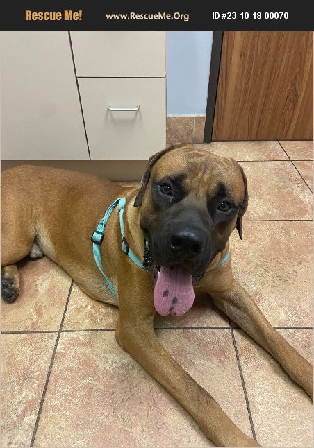 This is Max. He came to us 10 days ago, standing at our gate. I have fed him and kept him in our back yard and laundry room. Looking for a good forever home for this young man. The vet gave him vaccinations, he's heartworm negative but waiting to see about intestinal parasites. Favors one of his hips as he walks. Loves to run around. Teeth are clean, claws are short, sits on command. Friendly and energetic; I would keep him, except the rest of our dogs are much older and not ready for this bundle of energy. Currently 116 lbs, vet figures him to be one year old.