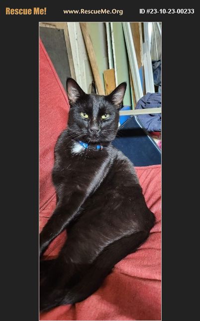 Black male cat with white patch on chest Roughly yr old Recently got neutered