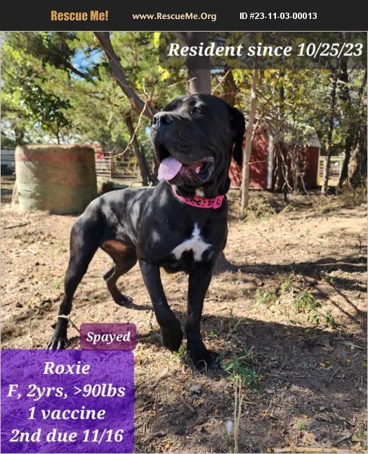 Roxie lived outside on a farm with two other dogs, one cat, and horses. She had no issues with any of them. She is a pretty laid back chic that needs a family of her own, that she can be a part of.. Roxie is a Cane Corso however that breed wasn't an option to list above