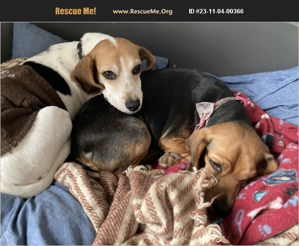 This bonded pair is possibly a mother daughter duo: Peggy (6 1/2 years, white / tri-color) and Eliza (5 1/2 years, brown / black). They are easy going and easy to love. If you want to snuggle up with two sweet, small dogs look no further! Peggy raises a paw for belly rubs. She loves to lay next to people and receive pets. Peggy doesn't trust other dogs right away, but will warm up to them with time. Eliza is curious and an adventurer, and she also loves her naps. She's very interested in walks and the outdoors, and will benefit from more leash training. Eliza is blind in one eye, but can navigate stairs just fine. Both girls are interested in dog toys such as ropes, balls, stuffed toys, and toys that squeak. Both tested negative for heartworm and are about 18 pounds each. They are potty trained. They've learned how to use a dog door. The girls prefer to sleep together at night in one large dog bed. Eliza will eat Peggy's food, and Eliza will let her, so meals should be monitored. The girls eat better with a little wet food and a little water mixed with dry kibble. Eliza has an excited sound when dog food is being prepared or when she thinks she might get to go on a walk. Otherwise both girls are fairly quiet for beagles. If you have room in your home and your heart for these two sweet girls, submit an application at www.apsofpc.org