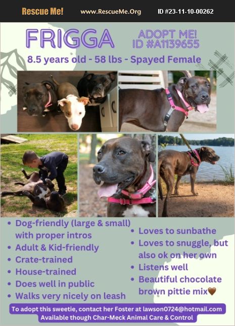Frigga is a great lady! She's little bit older so she has some arthritis but we give her Dasaquin daily and that has really helped. She also take Proin for some slight incontinence. She was just having a little bit of pee dribble when she sat but this medicine has fixed that but she would need to continue it. Frigga is house trained, crate trained, friendly with other dogs and is easy on the leash. She loves to snuggle but also has her moments where she just wants to lay alone. She's not aggressive but she'll give a soft growl to just say she's enjoying her alone time.